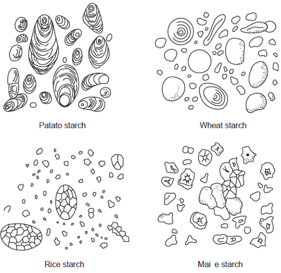 | Shape | Simple grains, angular, hilum, central, rarely compound grains. | Simple or compound grains ( components), polyhedral with sharp angles. | Mostly simple (large and small) grains, faint striations, hilum appears as line. | Flattened ovoid or sub-spherical, well-marked striations, hilum eccentric. |